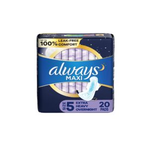 Always Maxi Pads Size 5 Extra Heavy Overnight Absorbency, with Wings, Unscented, Pack of 20